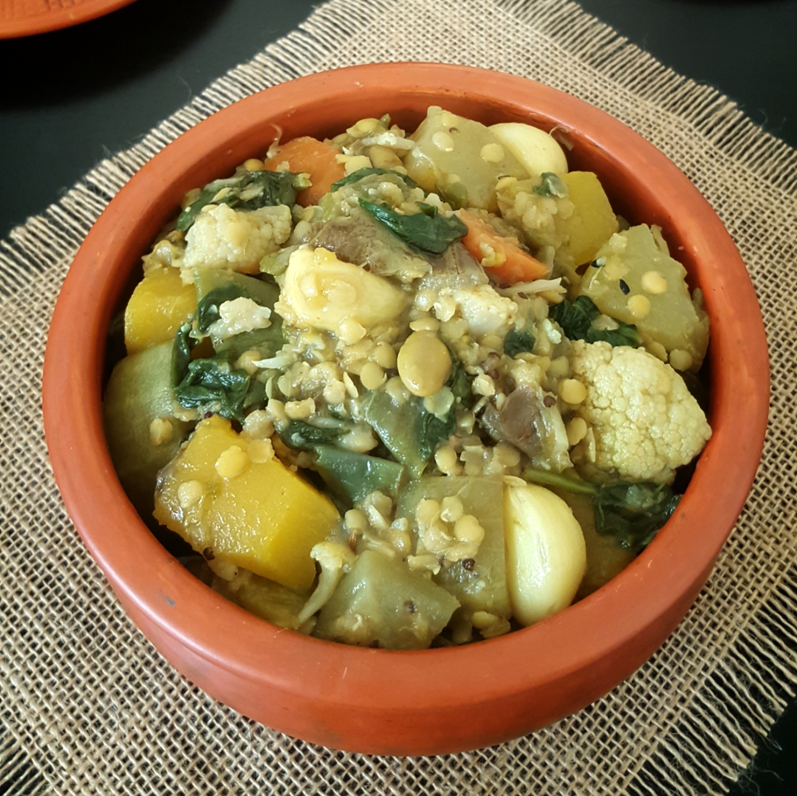 এবার প্যানে অলিভ অয়েল দিয়ে গরম করে পাঁচফোড়ন দিয়ে একটু ভেজে একে একে সব সবজি, পেঁয়াজ কুচি কাঁচামরিচ, লবণ, হলুদ গুঁড়া, ধনিয়া গুঁড়া, সামান্য পানি দিয়ে ঢেকে বেশি আঁচে জ্বাল নিন। সবজি যখন একটু নরম হয়ে আসবে তখন রসুনের কোয়া, ডাল দিয়ে নেড়ে ঢাকনা দিয়ে ঢেকে রাখুন। যদি পানির দেওয়ার প্রয়োজন হলে পানি দিন।