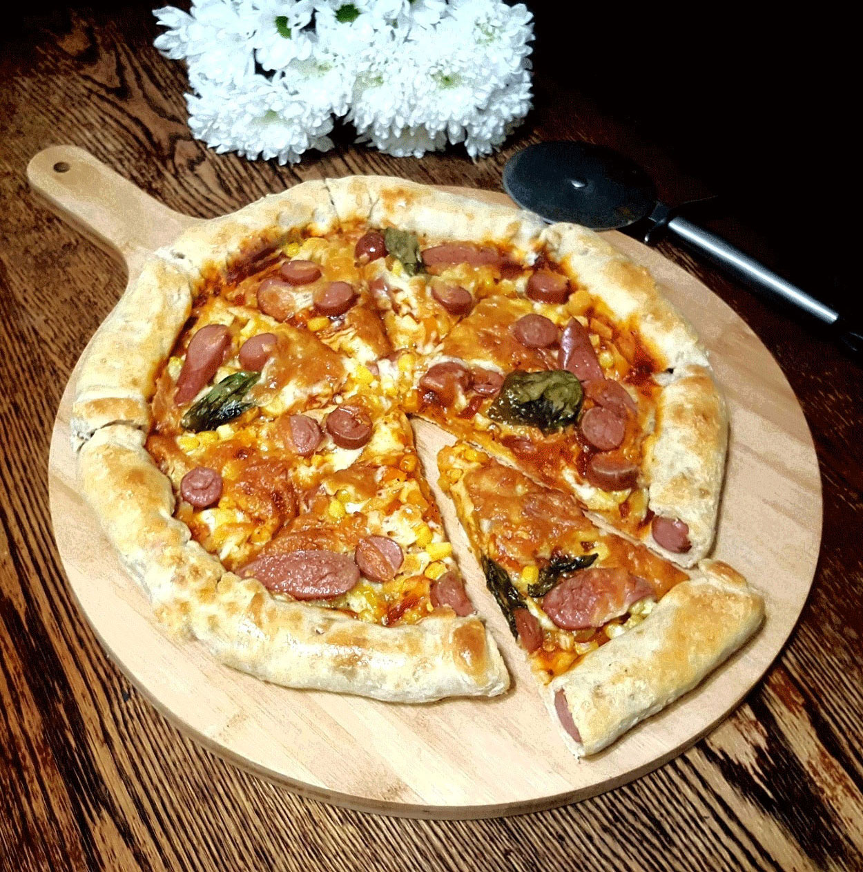 পিৎজা তৈরিঃ ডো ফুলে গেলে পাত্র থেকে নামিয়ে একটু ময়ান করে নিন। তারপর ময়দা ছিটিয়ে বড় একটি পাতলা রুটি বেলে নিয়ে পিৎজা মোল্ড এর উপর রেখে দিন (চারপাশ দিয়ে রুটি যাতে বাড়তি থাকে)। এবার চারপাশ দিয়ে সসেজ দিয়ে বাড়তি রুটি সসেজগুলোর উপর ঘুরিয়ে কাভার করে দিতে হবে। এবার কাটাচামচ দিয়ে মাঝখানে ছিদ্র ছিদ্র করে দিতে হবে (এতে করে পিৎজার ডো মাঝখান দিয়ে ফুলবে না)।